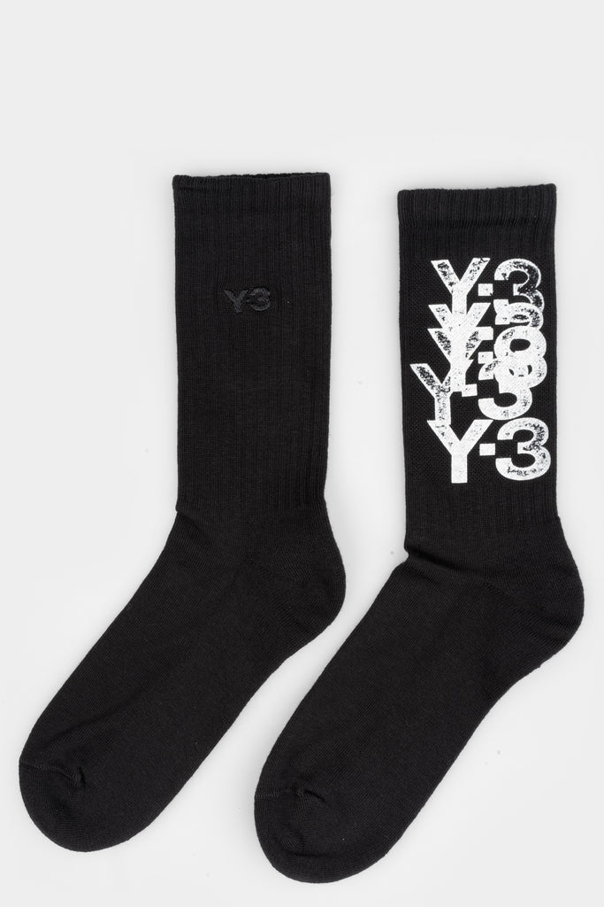 Men’s black, thick cotton blend socks featuring multiple Y-3 logos in white from the SS26 collection from Y-3.