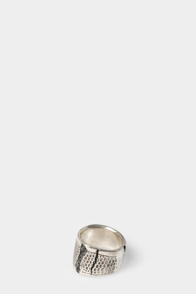 Large embossed black diamonds oxidized silver ring with texture similar do crocodile skin from Enri Mars.
