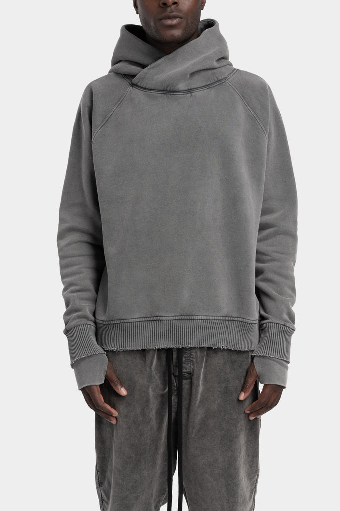 Men’s washed grey cotton blend hooded sweater featuring raglan shoulders, an asymmetrical neckline & ribbed cuffs from the FW25 collection from Thom/Krom.