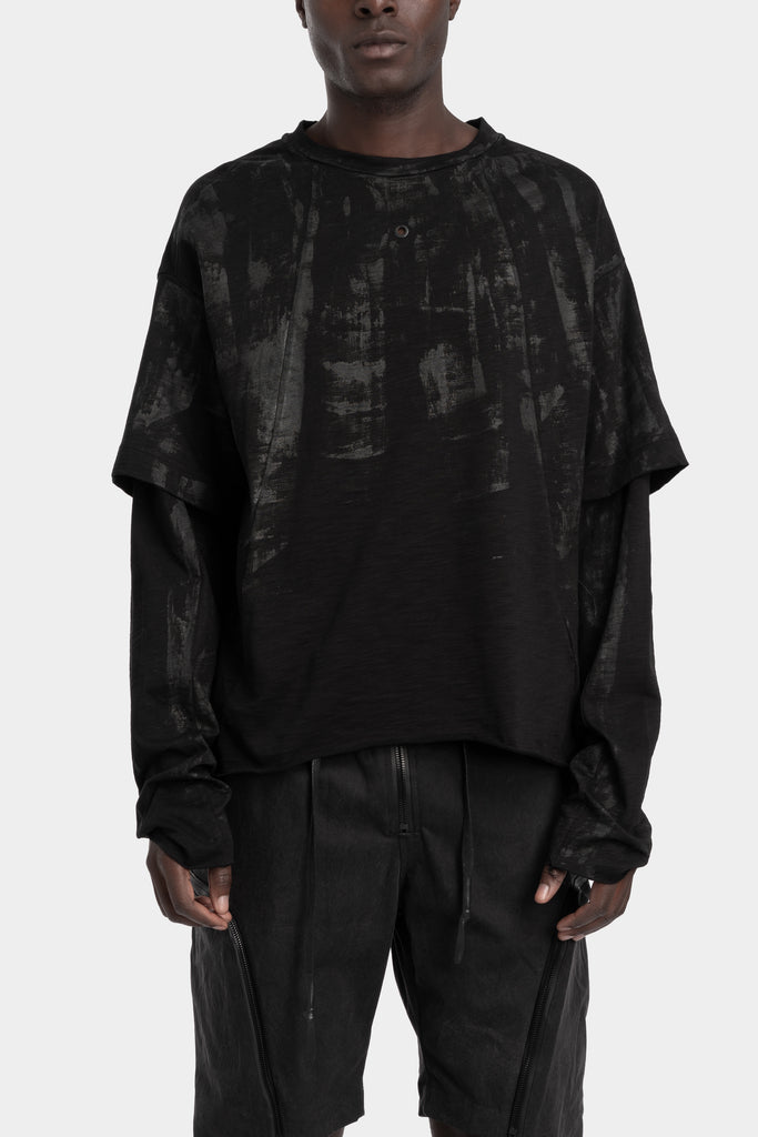 Men’s black layered long sleeve cotton t-shirt featuring an irregular tar coating from the AW25/26 collection from Gall Laboratories.