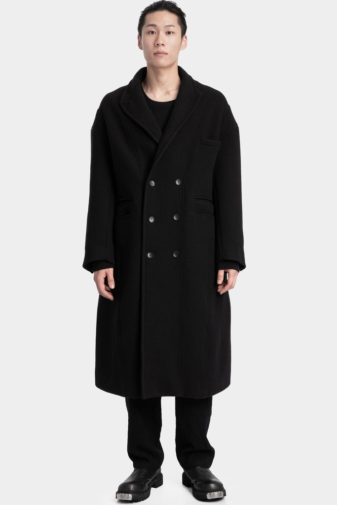 Men's oversized double breasted overcoat in black woven wool blend featuring outward turned seams from the AW25 collection from Andrea Ya'Aqov.