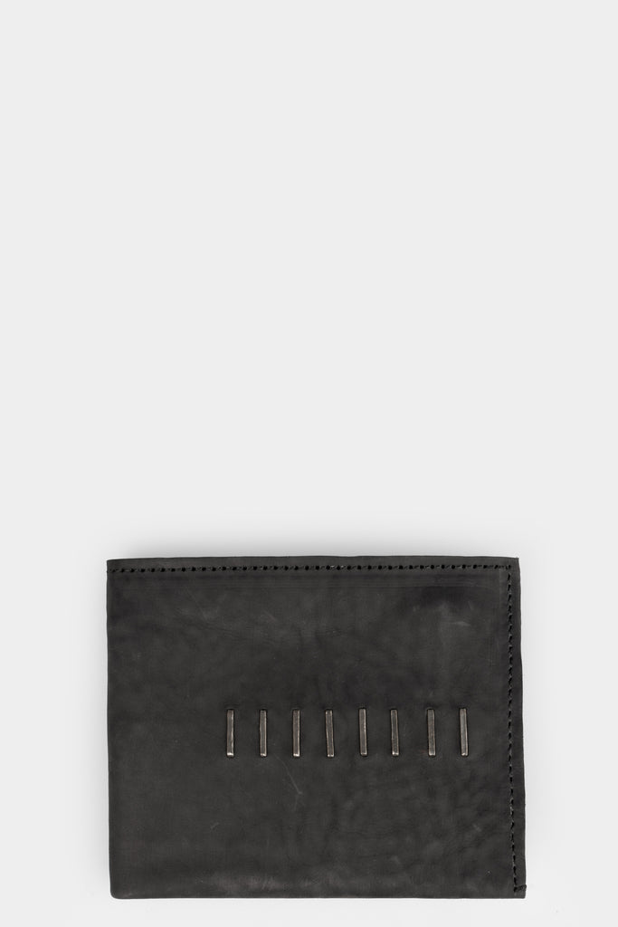 Men’s small, black leather wallet featuring signature 925 silver staple details from Daniele Basta.