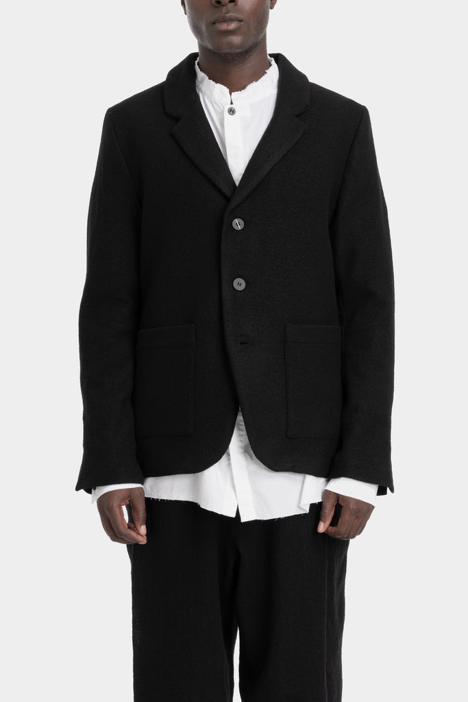 Men’s black 3 button wool blazer featuring two front side patched pockets from the FW25 collection from Thom/Krom.