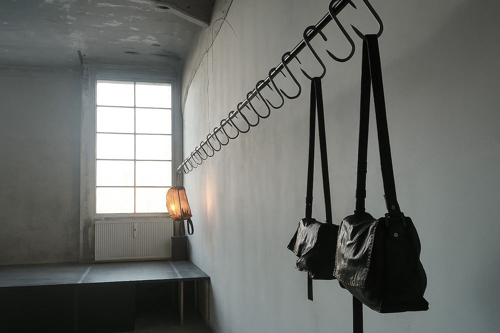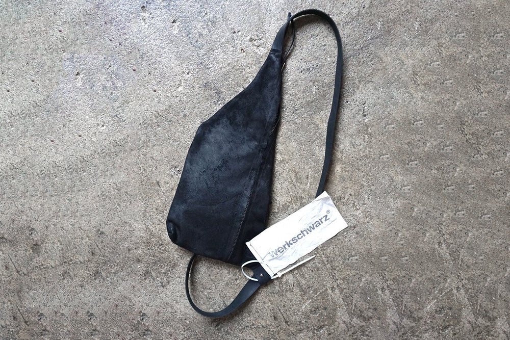 WERKSCHWARZ crea bolsos y accesorios de piel hechos a mano en tonos negros profundos: piezas minimalistas, duraderas y unisex elaboradas con piel de curtido vegetal de geometría escultural y utilidad atemporal.