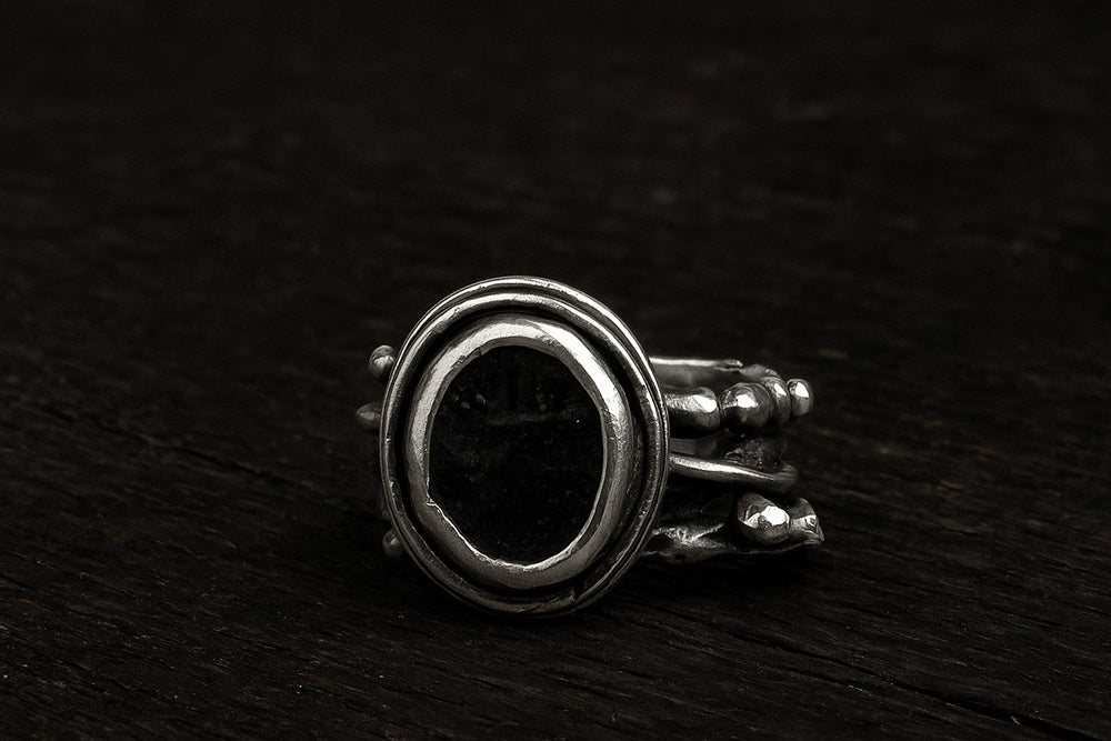 Enri Mars crea joyas artesanales de plata italiana con texturas crudas, formas escultóricas y acabados oxidados, elaboradas en pequeños lotes con precisión artesanal.