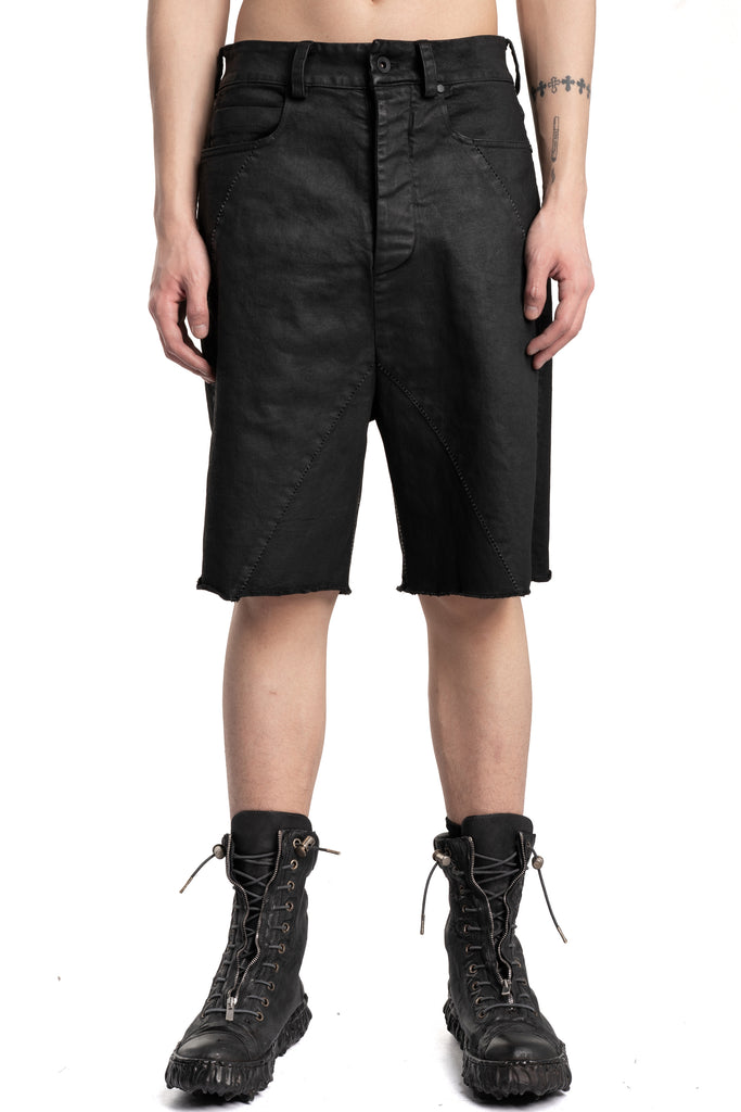 Men's relax-fit stretch denim shorts with cracked croco-like surface coating and raw-cut hems from the SS26 collection from MD75.