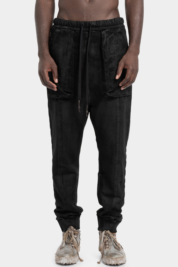 Men's black coated cotton drawstring sweatpants featuring large patch pockets in the front and back from the AW25/26 collection from MD75.