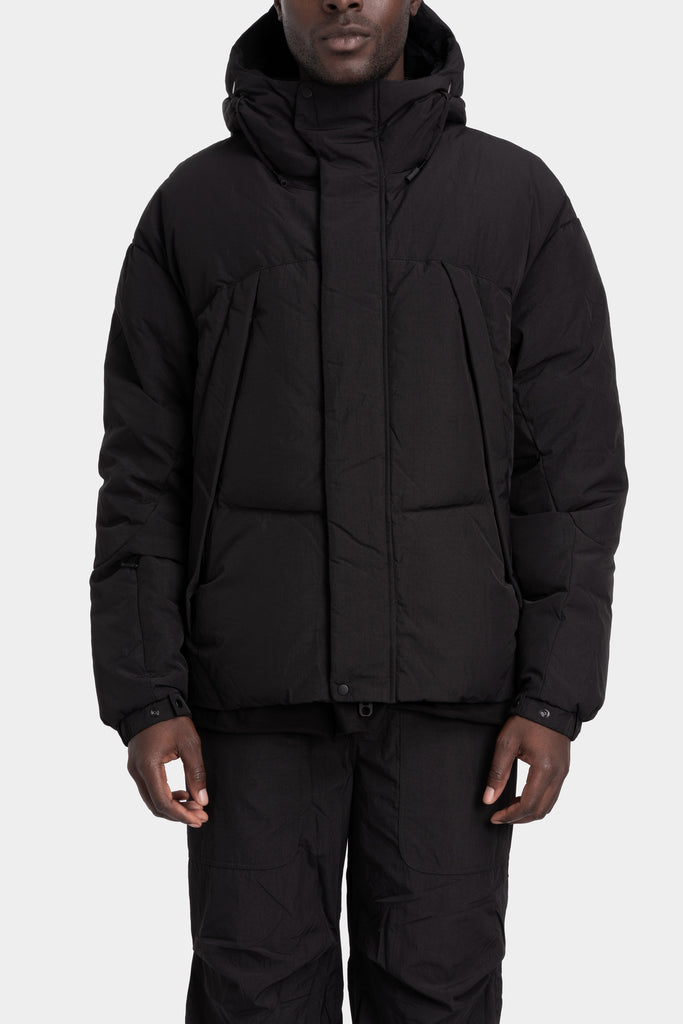 Men’s black hooded down jacket in water-proof nylon from the 04 collection from JG1 by Justin Gall.