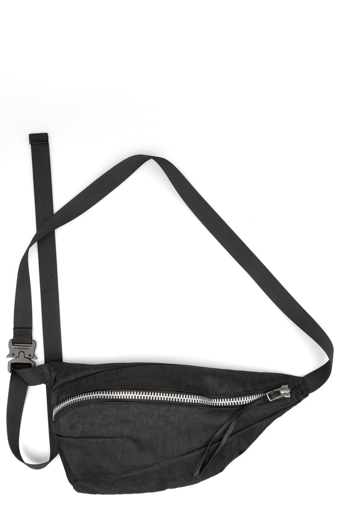 Unisex black crossbody bag in heavy weight woven nylon, fully lined with an inner zip compartment from Werkschwarz.