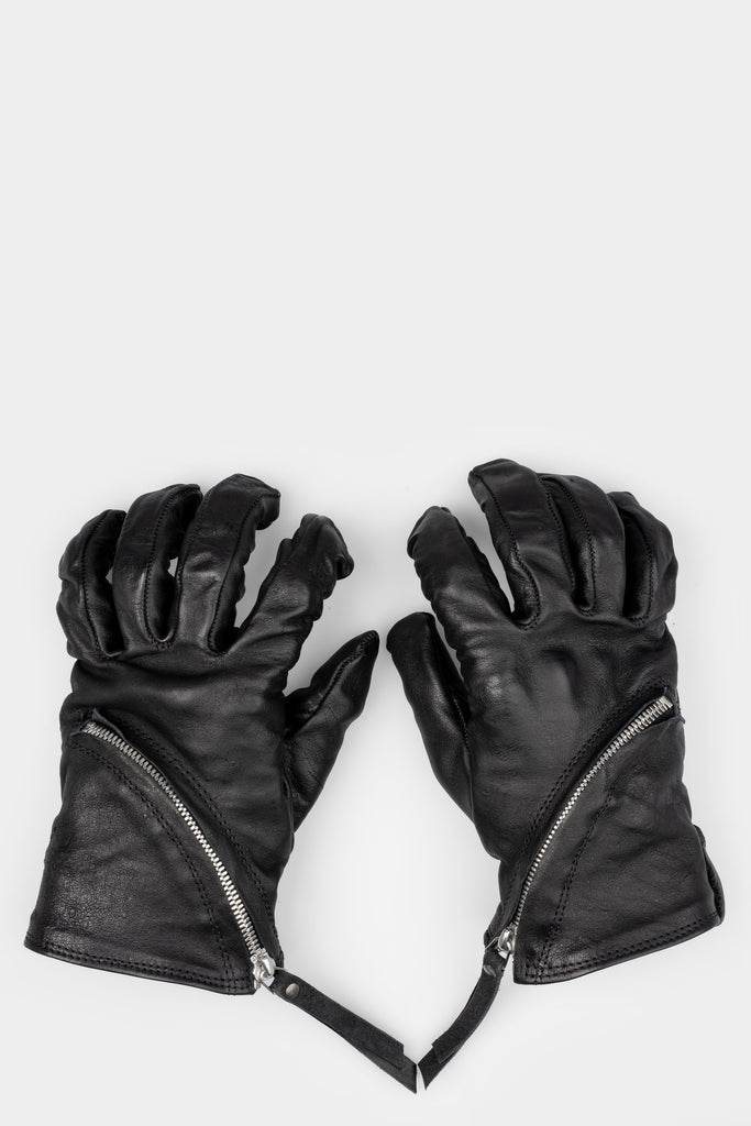 Unisex black leather gloves featuring a spiral zipper from 0-Hide.