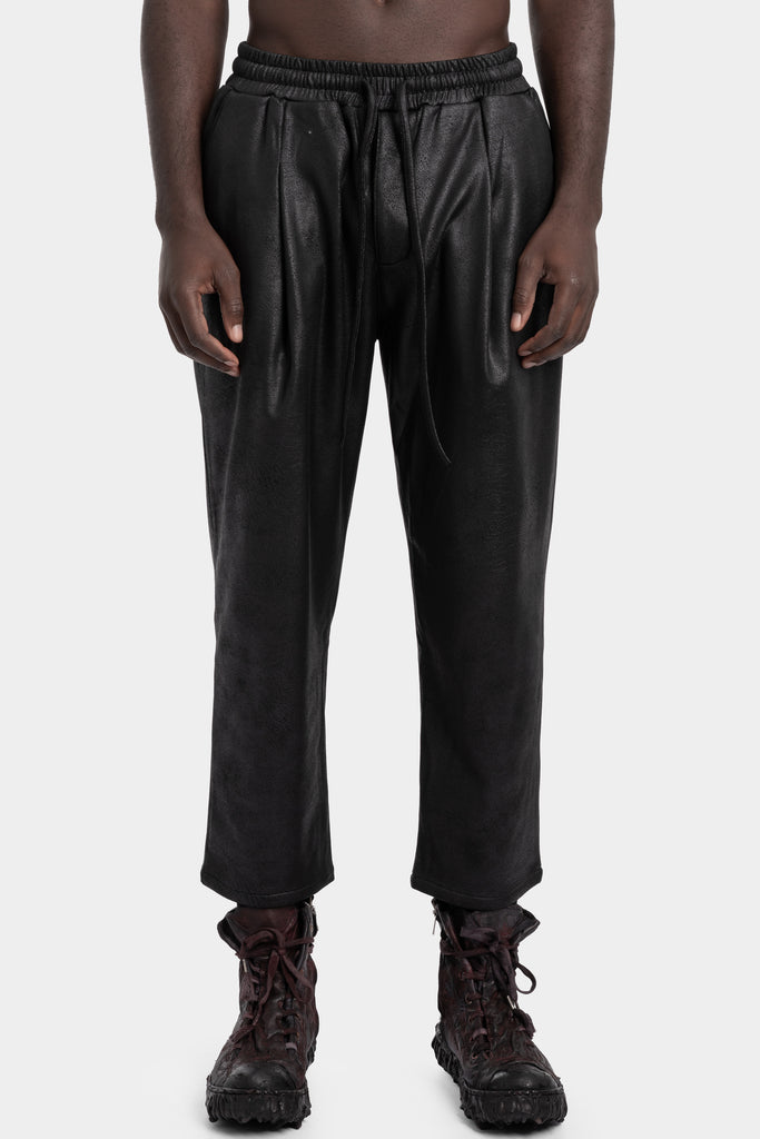 Men's black vegan leather sweatpants featuring elastic waistband with drawstrings from the AW25 collection from Never Enough