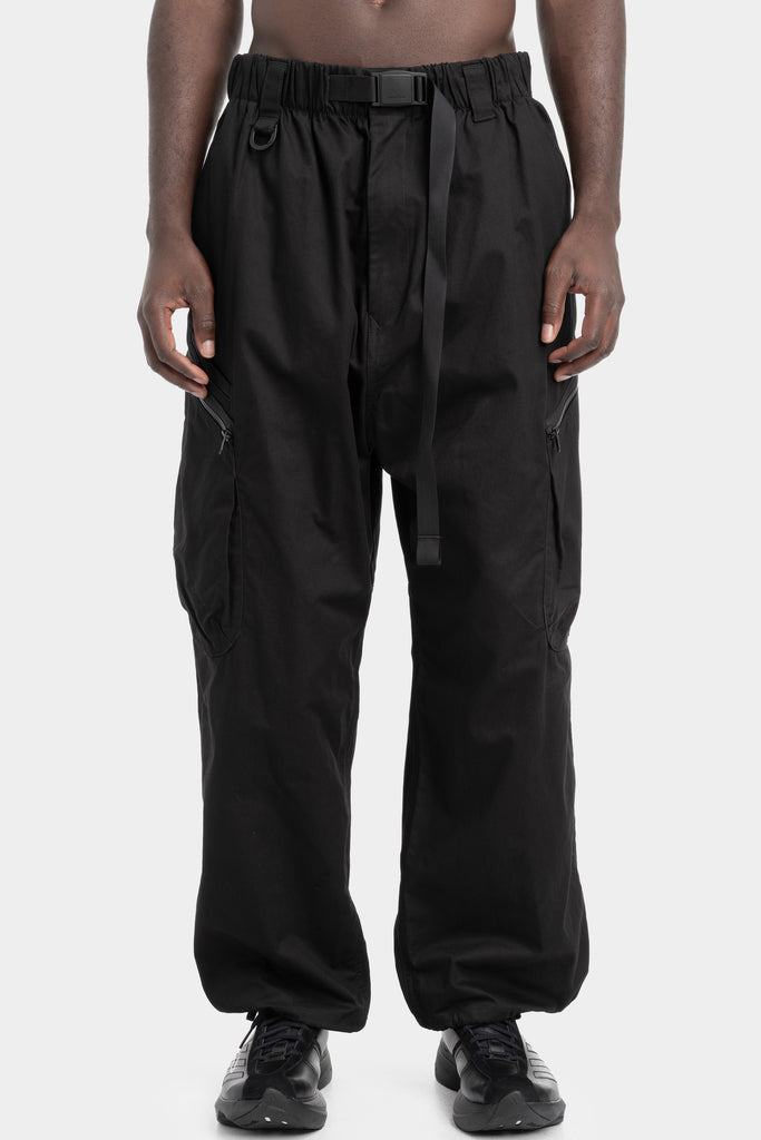 Men's oversized cargo pants in black woven twill featuring an elastic waist with integrated belt, two large zip cargo pockets on legs and patch pockets at back from the AW25 collection from Y-3 (Yohji Yamamoto x Adidas).