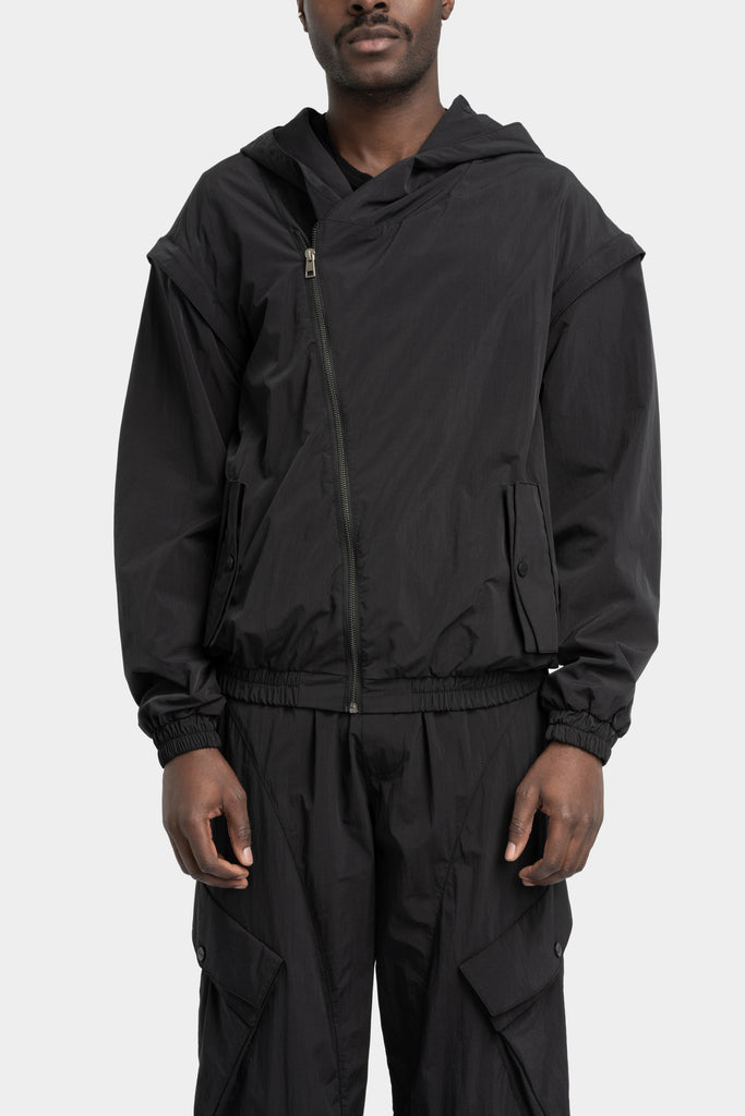Men's bomber jacket in soft woven nylon featuring detachable sleeves and an asymmetrical double slider zip closure from the SS25 collection from La Haine Inside Us.