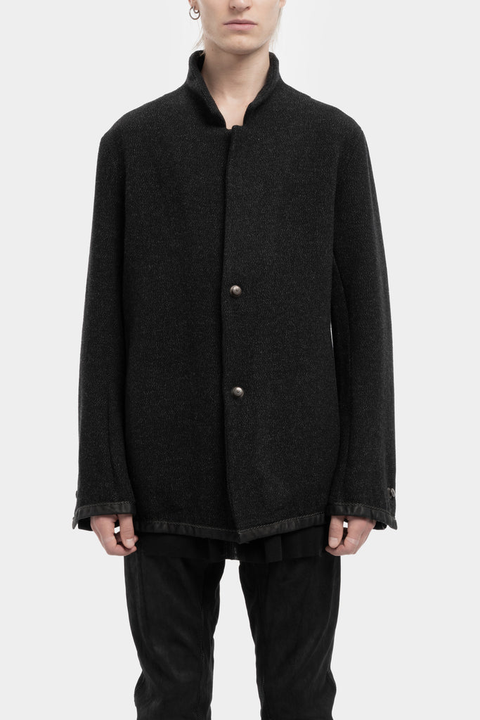Men's black melange double buttoned wool blazer jacket featuring old German nautical buttons and leather trimming from the AW25 collection from 69 by Isaac Sellam.