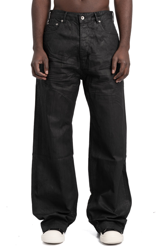 Men's full length, 5 pocket jeans with low rise and wide fit featuring in deep black stretch denim from Rick Owens DRKSHDW SS26 "Temple".