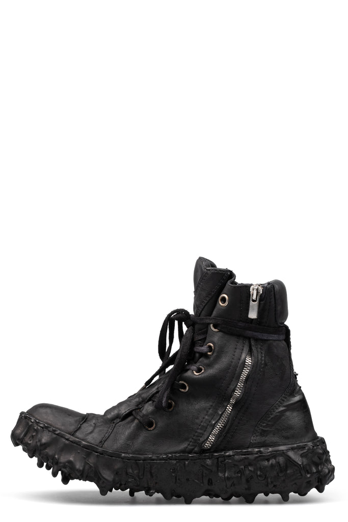Men’s deep black, hand dyed high top leather sneakers featuring a new "hidden" front lacing and side zipper from Culture of Brave.