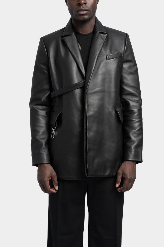 Men's black leather blazer featuring hidden single button closure and a carabiner hook detail from Söderberg.