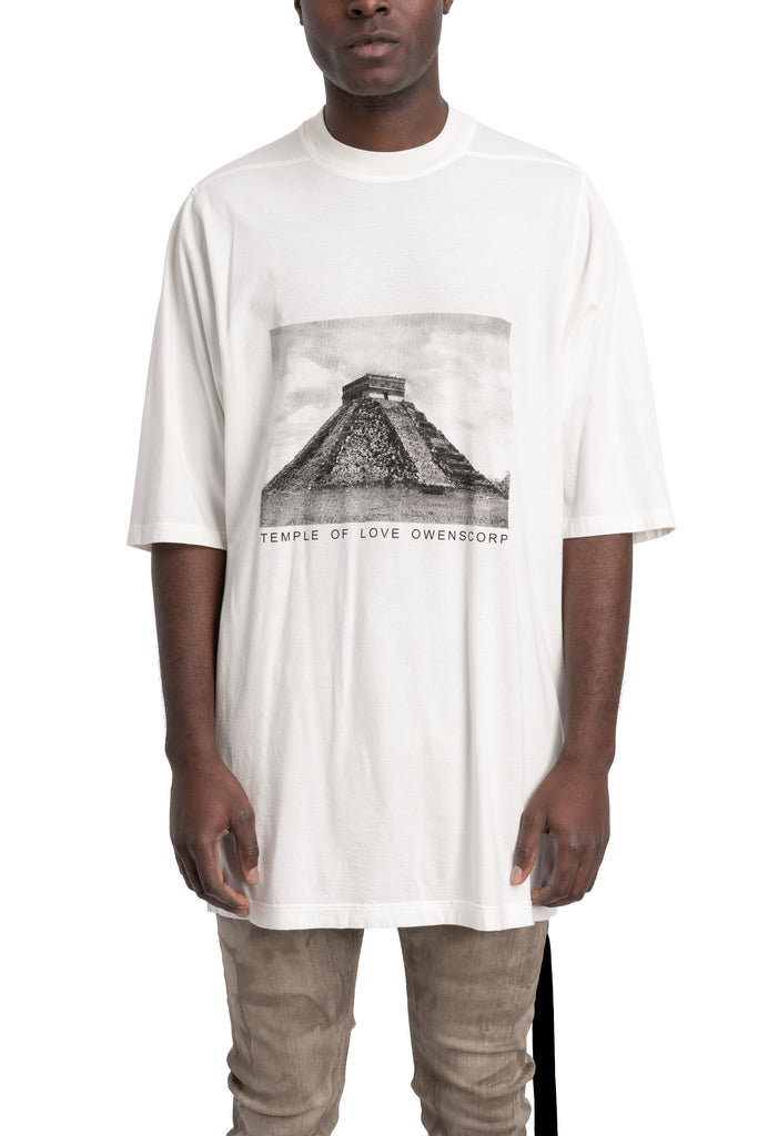 Men's long and loose T-Shirt in milk white knit cotton jersey with black Temple Of Love print on front from Rick Owens DRKSHDW SS26 "Temple".