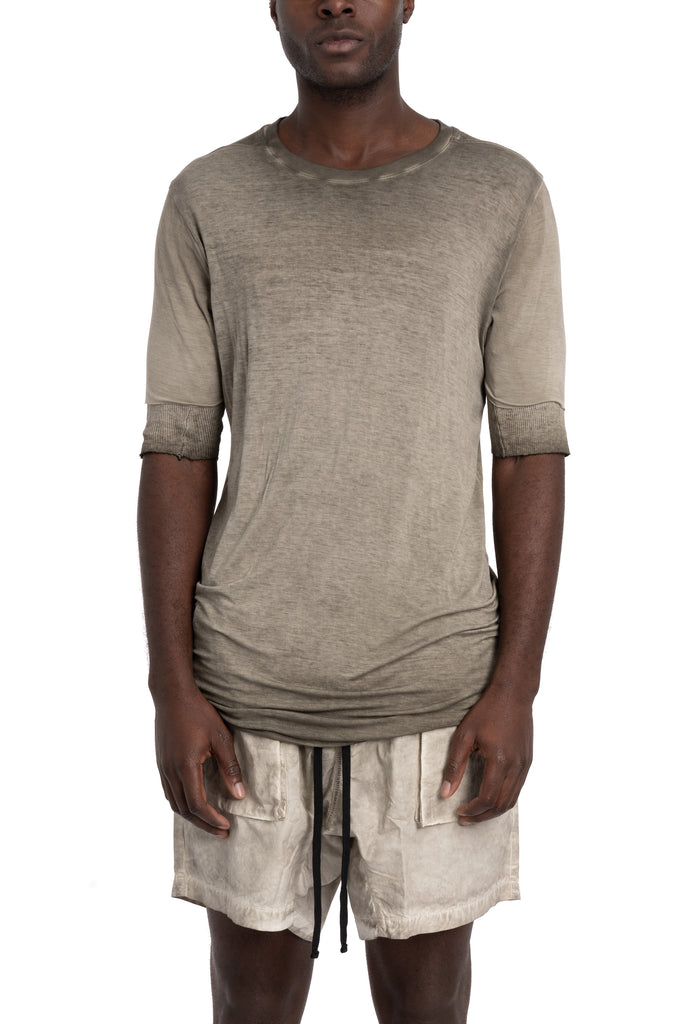 Men's cold dyed olive green double layered ribbed t-shirt featuring scar-stitch details from the SS26 collection from Thom Krom.