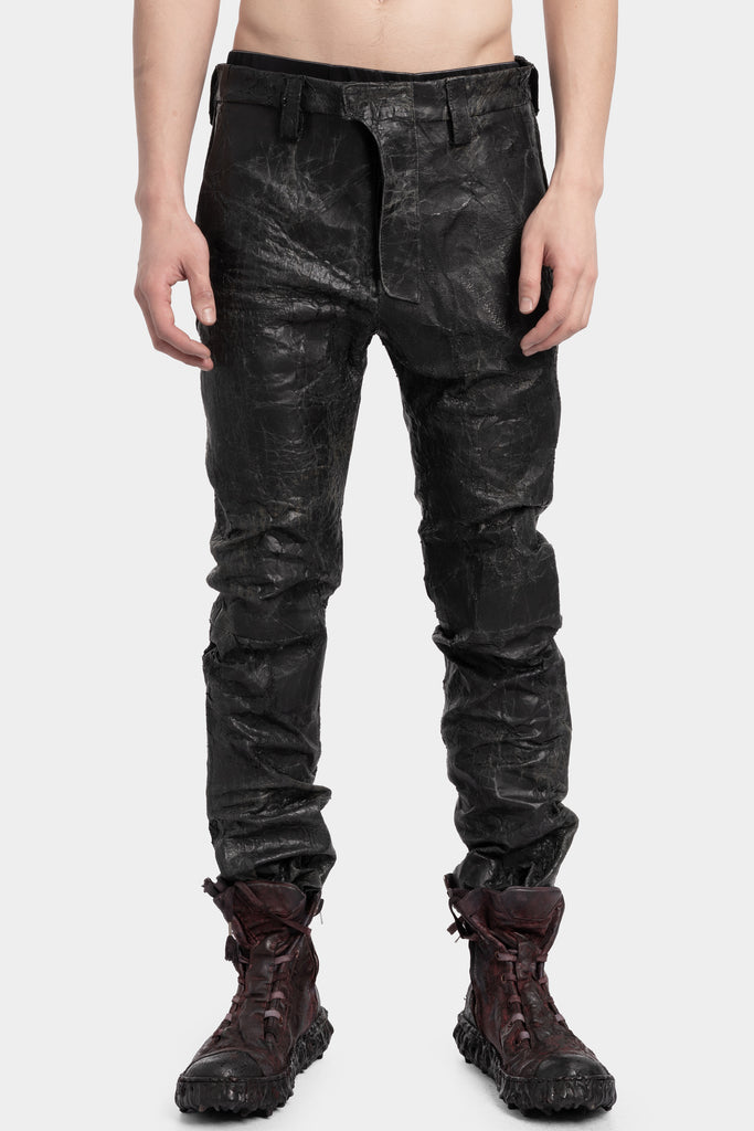 Men's pants in black waxed and distressed wild horse leather featuring cracks throughout from Botta-S.