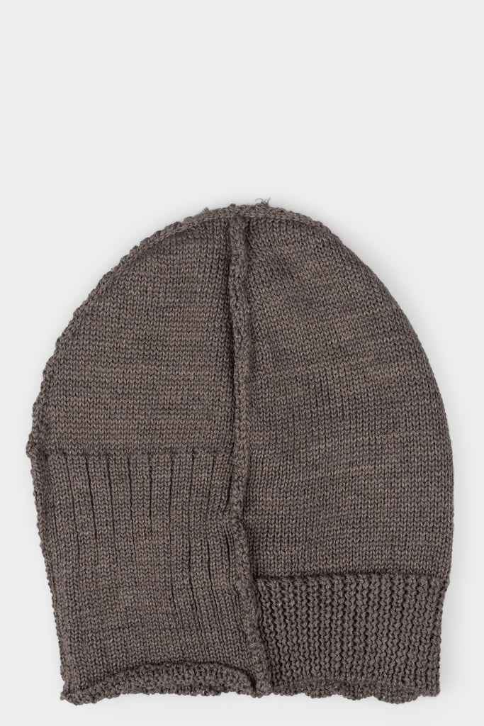 Men’s grey wool and linen patchwork knit beanie featuring an irregular rib hem from the AW25/26 collection from Masnada.