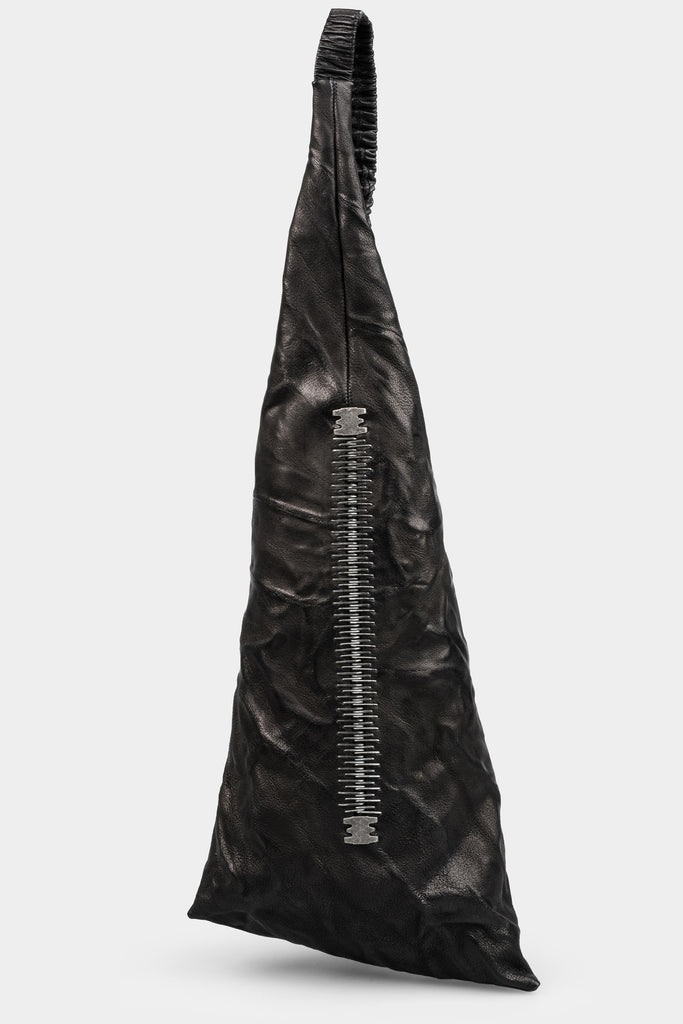 Unisex black lamb triangle shaped leather crossbody bag with signature staple details from Isaac Sellam.