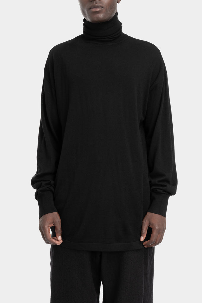 Men's black turtleneck knit sweater in superfine merino wool featuring overlong sleeves from the AW25/26 collection from Joe Chia.