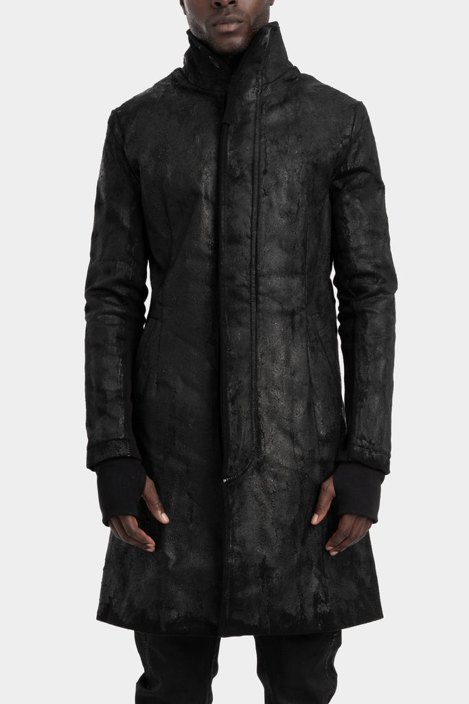 Men's long high neck coat in woven wool cashmere blend featuring a hand painted finish with polyurethane brushstrokes and zip closure from the MD75 AW25 collection.
