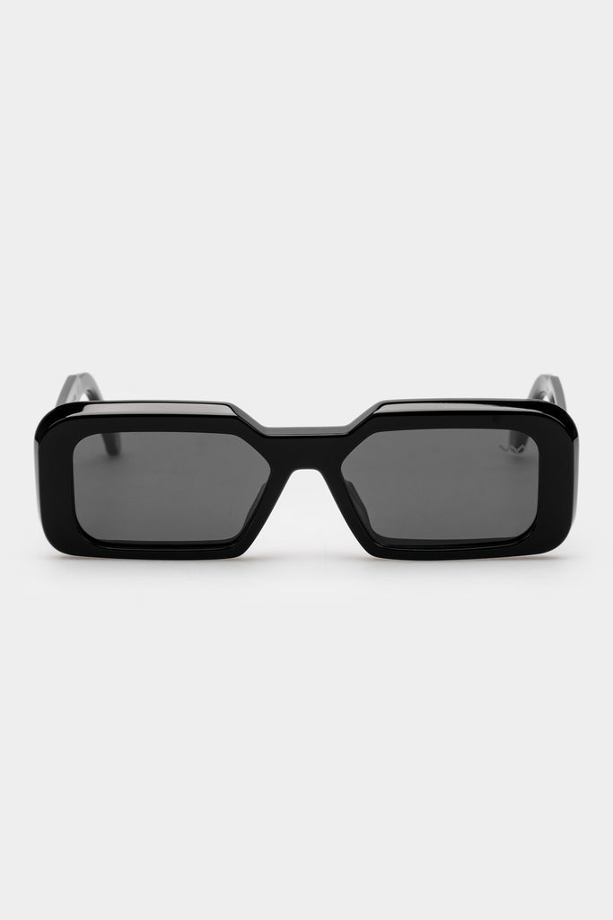 Unisex glossy black rectangular shaped sunglasses with metal colour hinges featuring a chunky frame made from natural recyclable acetate from the line "White label" from VAVA Eyewear.