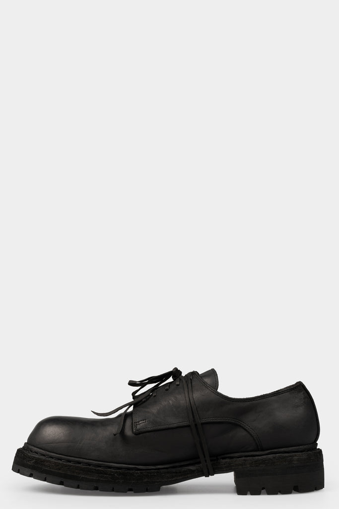 Men’s black full grain horse leather derbies with a chunky stacked leather sole and Orimono world exclusive black stitching from Guidi.