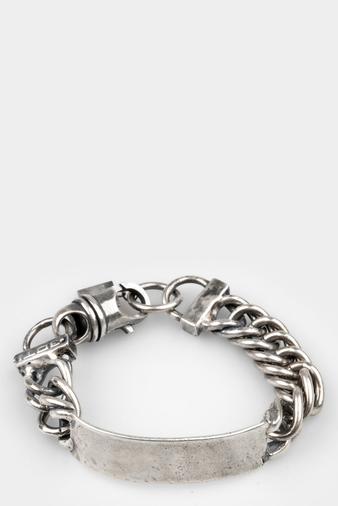 Men's chunky silver chain bracelet featuring a shaped plate part and silver clasp from GOTI.
