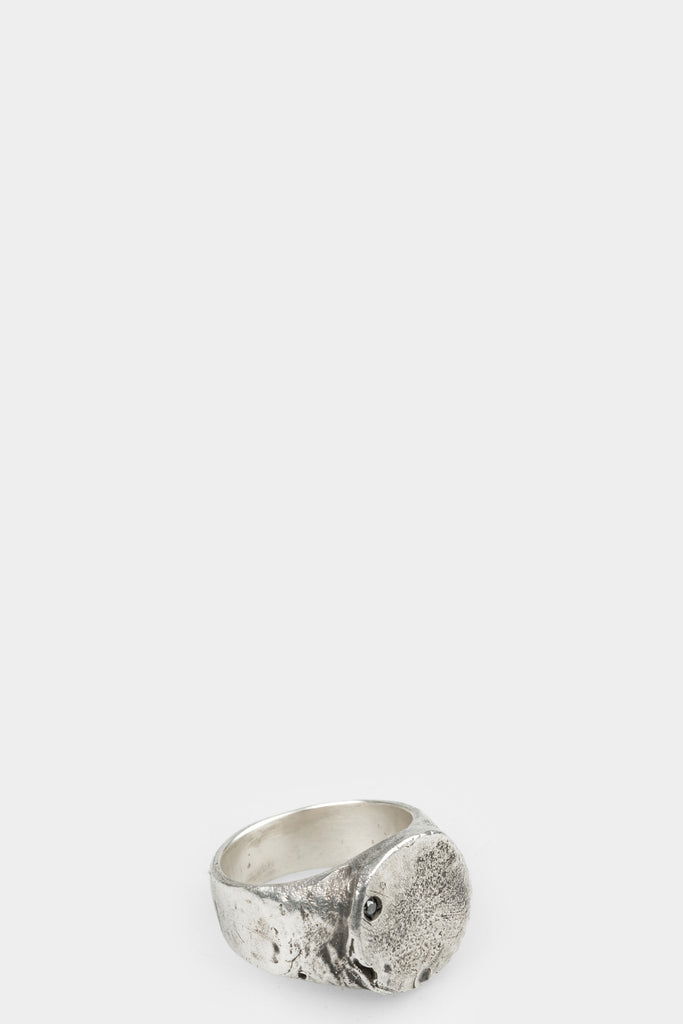 Large signet ring in oxidized silver with a black diamond from Enri Mars.