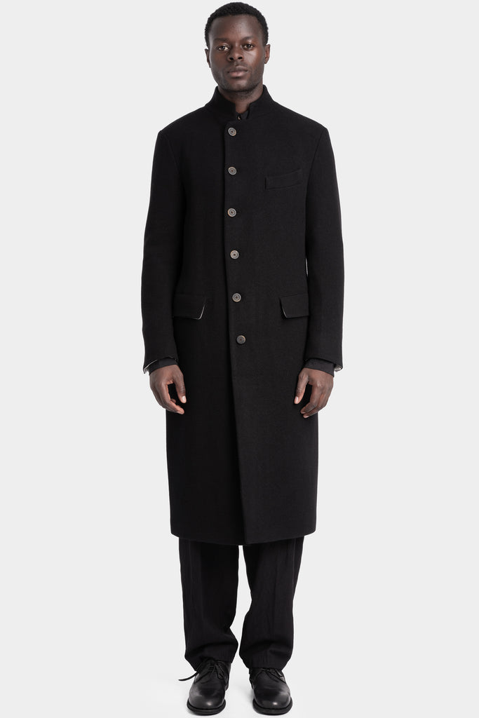 Men's clergy coat in woven black virgin wool and cashmere from the AW25 collection from Forme D'Expression.