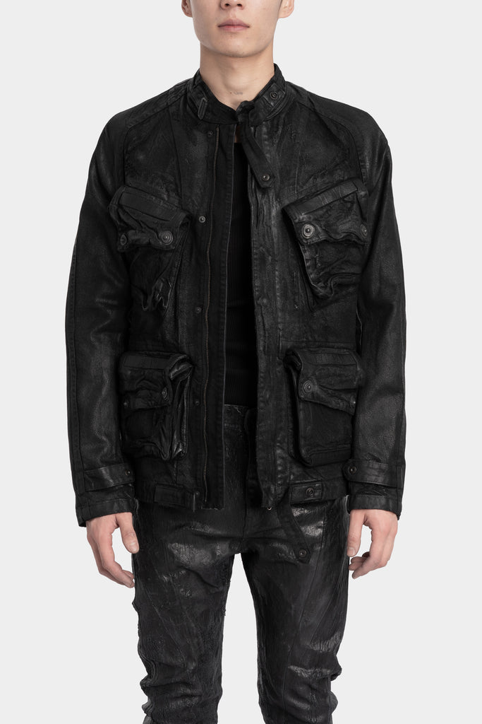 Men’s black coated, standing collar denim jacket featuring four cargo pockets in the front from the AW25/26 collection from Julius.