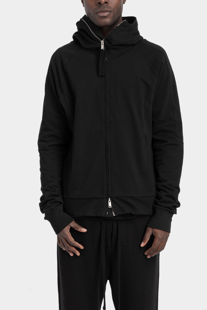 Men's black zip hoodie in cotton sweat jersey featuring contrast fabric inserts from the SS26 collection from Thom Krom.