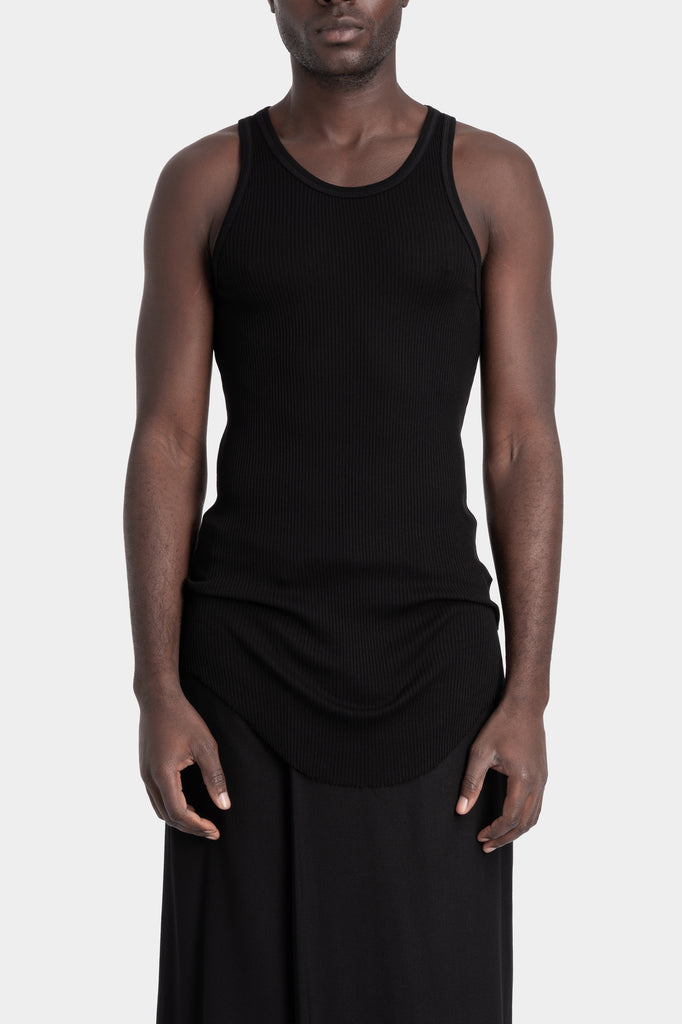 Men's tank top in black silk cotton rib jersey with double rib at arm holes and neckline and a rounded bottom raw cut hem from the Julius_7 AW25 collection "Garden".