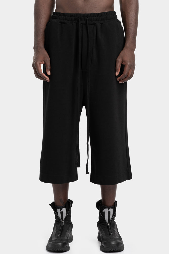 Men’s black cropped 3/4 drawstring pants in a cotton blend jersey from the FW25 collection from Thom/Krom.