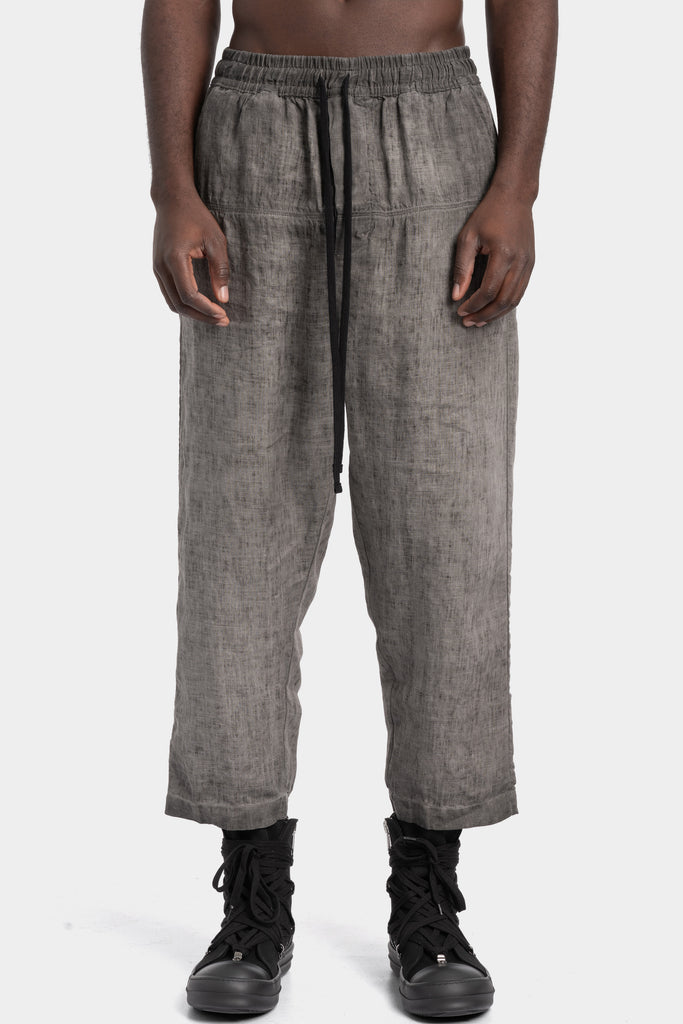 Men's cold dyed grey linen drawstring cropped pants from the SS26 collection from Thom Krom.
