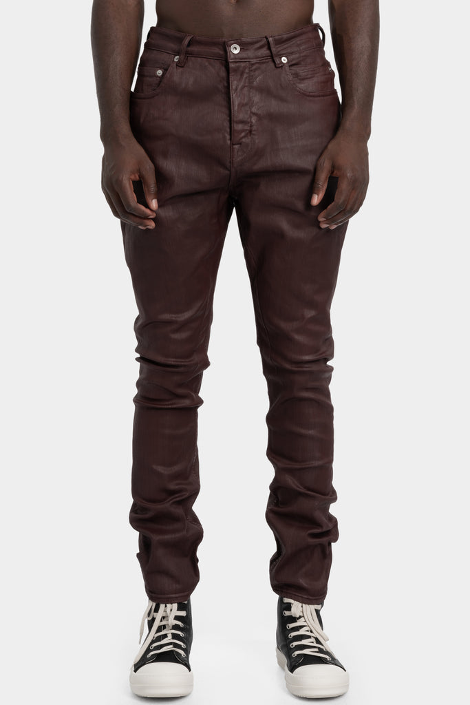 Men's red slim fit, 6 pocket jeans with low rise featuring a waxed finish from CONCORDIANScollection from Rick Owens DRKSHDW.