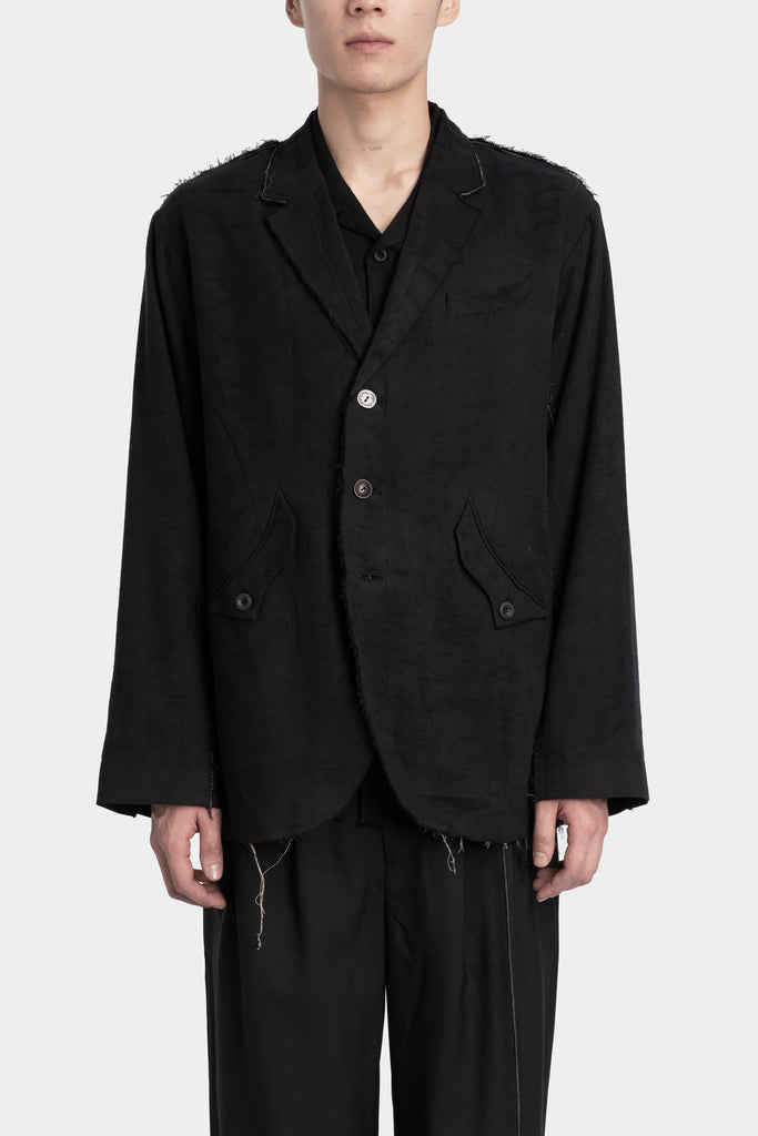 Men's black three button blazer in soft, structured cotton woven on an ancient European loom featuring raw cut edges, hand aged details and aged metal buttons from the limited collection Forgotten Materials from Professor.E.