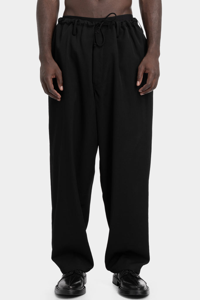 Men’s black woven wool drop crotch pants featuring a waist drawstring from the FW25 collection from Y’s Yohji Yamamoto.