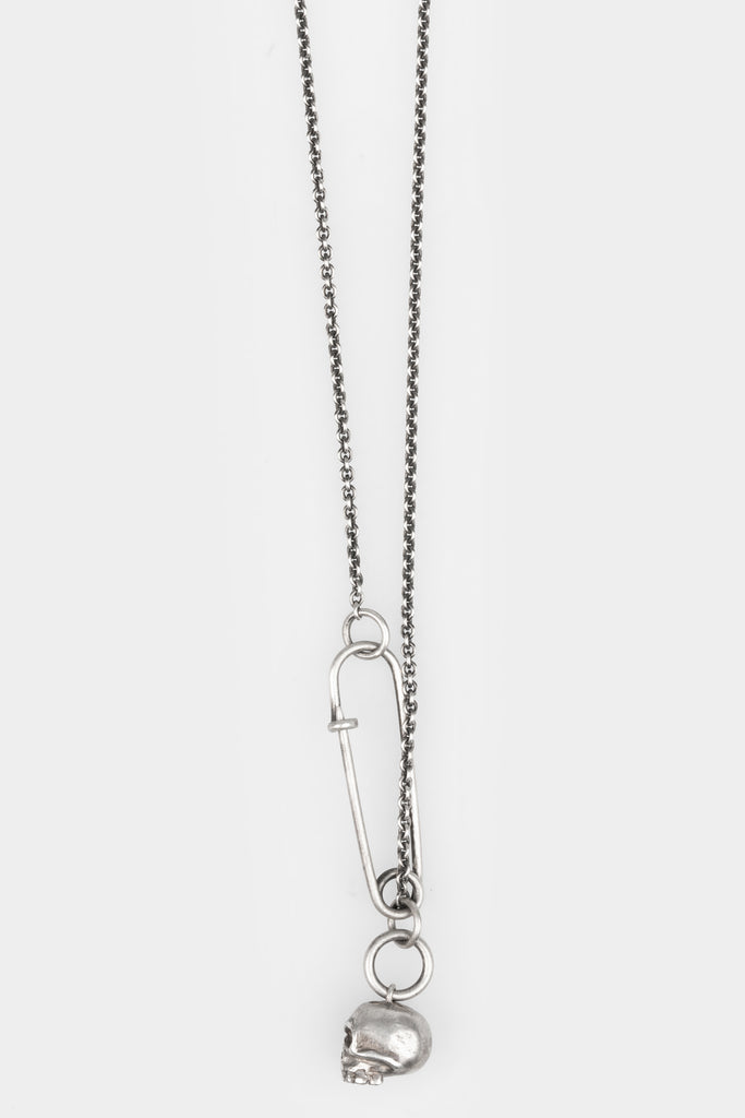 Fine silver chain with safety pin featuring a skull charm from Werkstatt München.