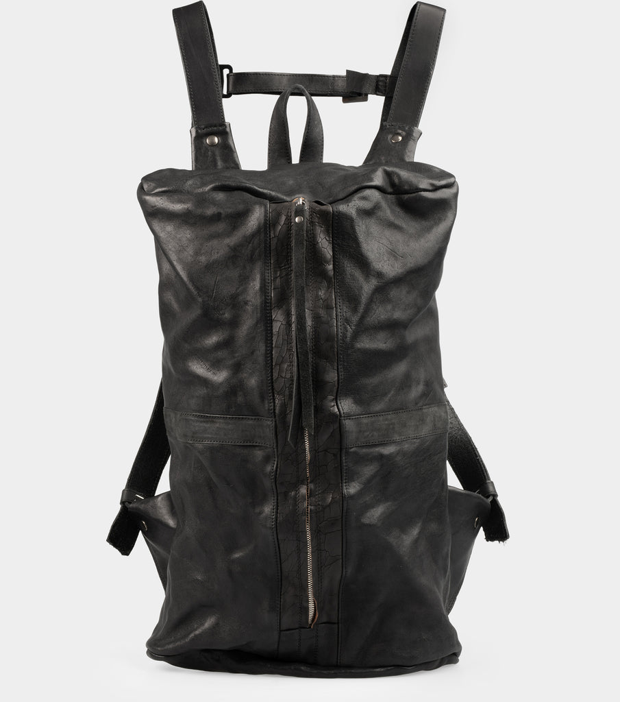 Unisex spine leather backpack in horse leather featuring hammered steel hardware from 0-Hide.