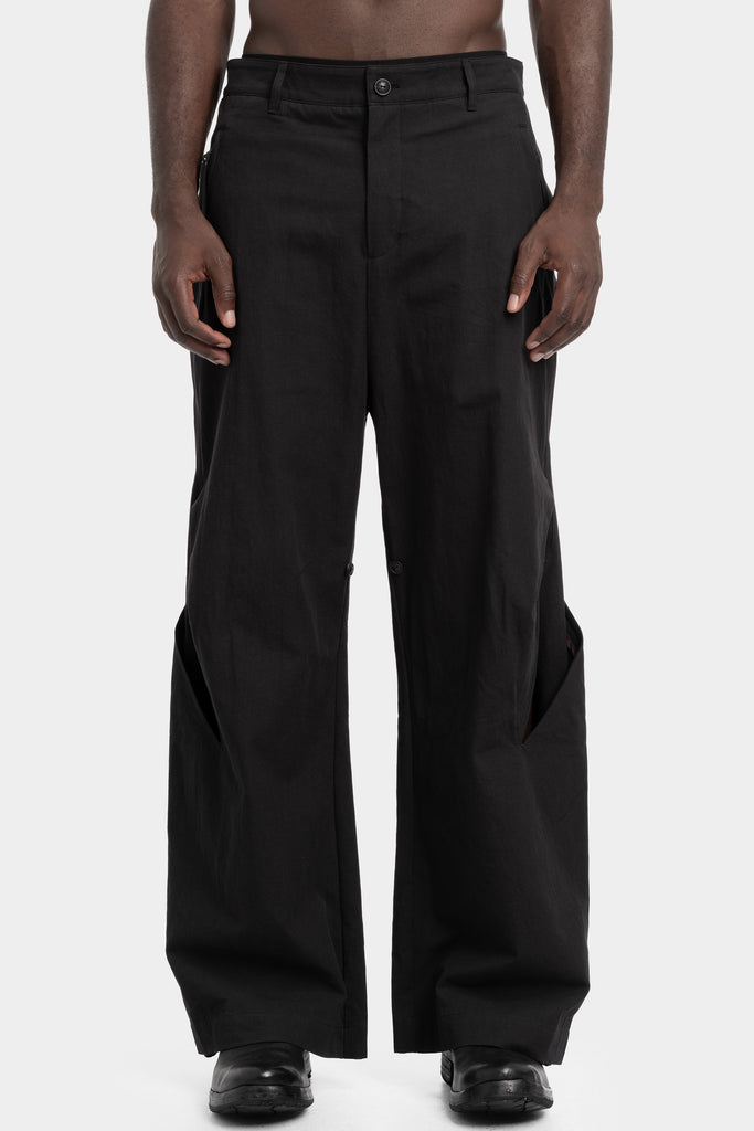 Men's loose pants in woven cotton and hemp blend featuring cut outs over knees with large buttoned pleats from the AW25 collection from Professor.E.