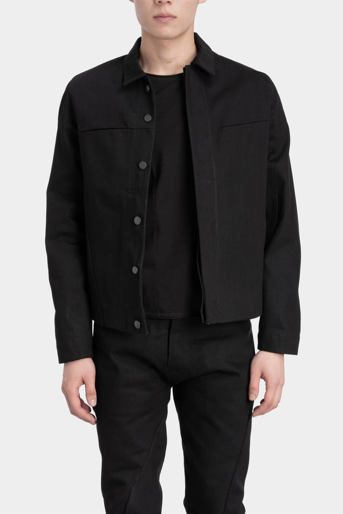 Men’s black worker jacket in a heavy cotton denim featuring Leon's signature geometrical pattern from collection "EINS" from LEB by Leon Emanuel Blanck.