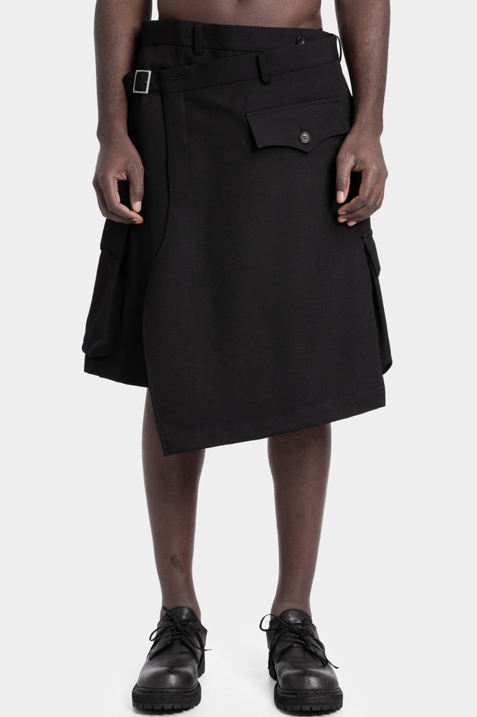 Men's black, asymmetrical shorts / skirt in black woven virgin wool from the Comme des Garçons Homme Plus AW25 collection.